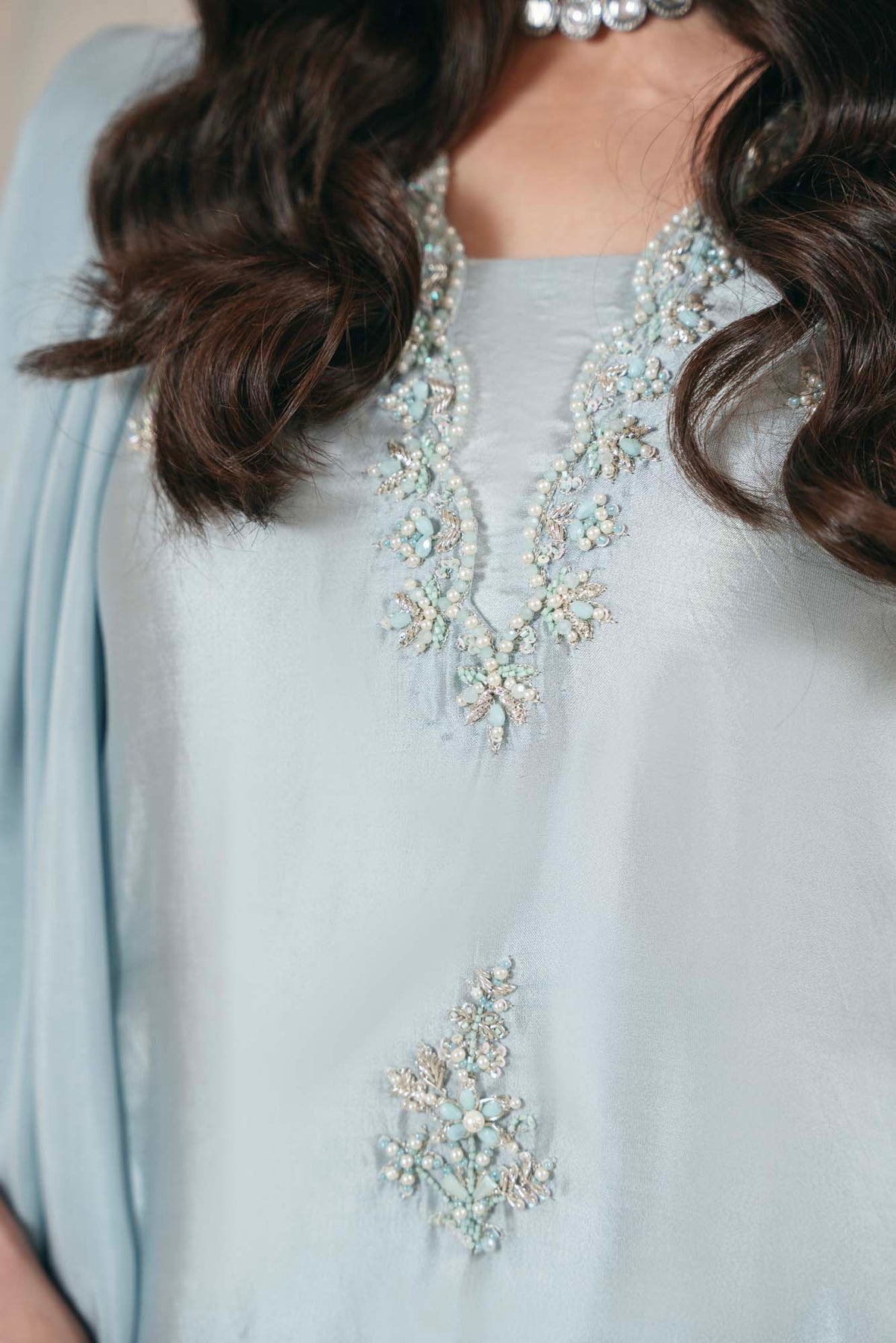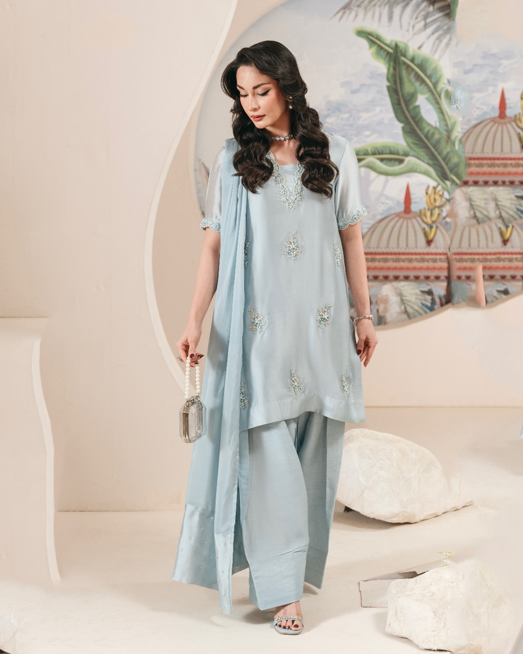 Luxurious ensemble features a Raw Silk Shirt with delicate handmade work, paired with Bamber chiffon Fabric Dupatta for a perfect blend of comfort and style. The look is completed with a flowing Raw Silk Trouser, all in a refreshing sky-blue hue. Crafted with precision and elegance, this set is perfect for any special occasion.