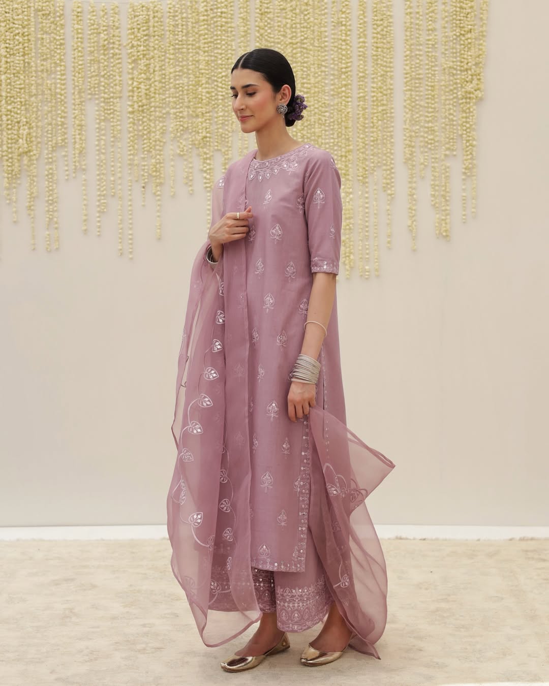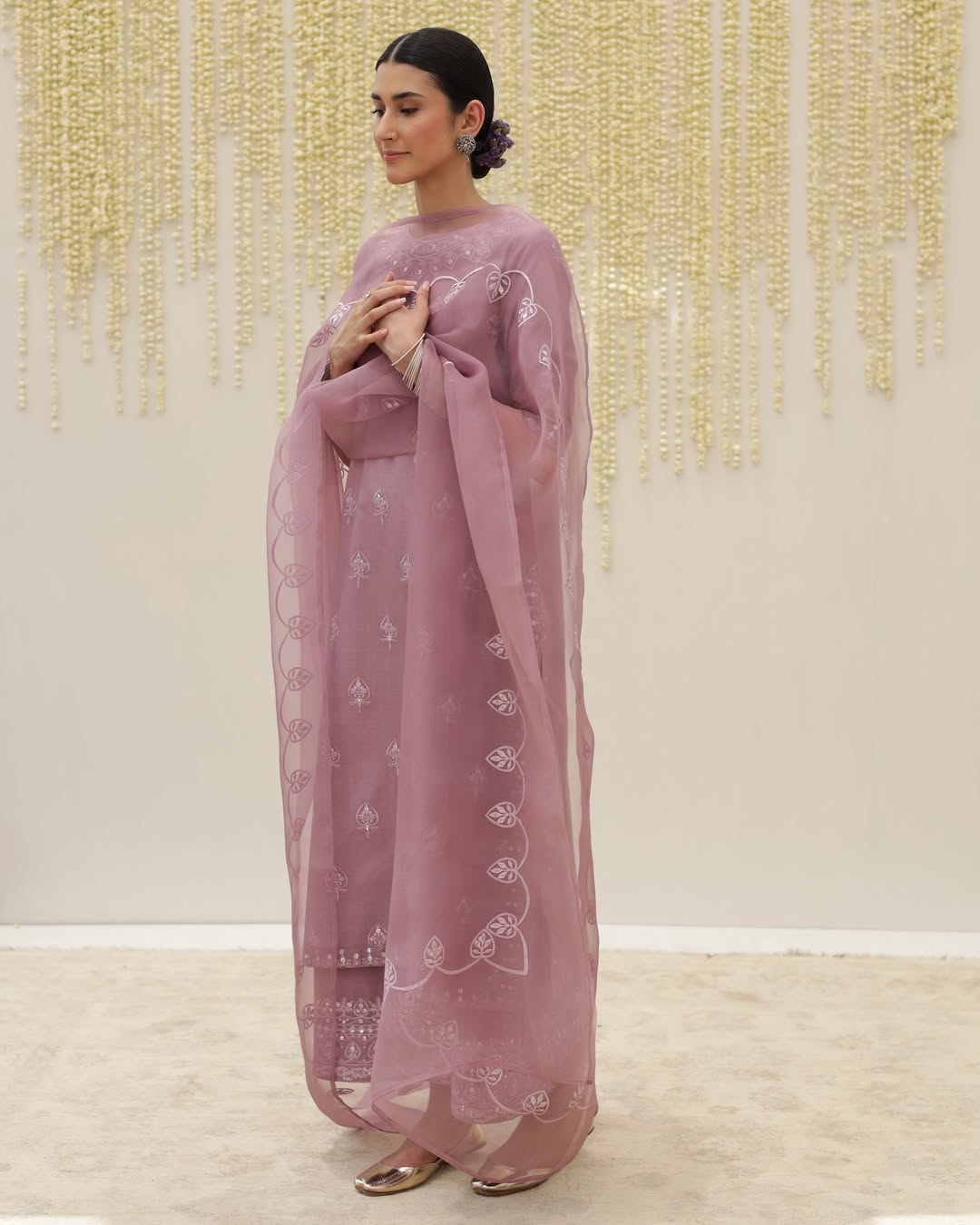Indulge in timeless sophistication with our "Lilac Purple" 3-piece formal set, crafted for the modern woman who loves understated luxury. The short-sleeved shirt boasts dainty floral motifs and heavy lace embroidery along the hem, exuding refined charm. Paired with flowy, tailored trousers for a polished look, the ensemble is completed with a sheer dupatta adorned with subtle lace accents. Ideal for weddings, festive gatherings, or any occasion demanding grace and poise.